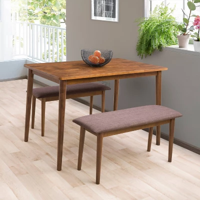 A trendy set with classic lines, these modern cushioned benches bring function and style to your dining room. They match perfectly with the mid-century modern table with splayed legs. The clean modern lines allow for plenty of dining space. Set includes 1 table, 2 benches.