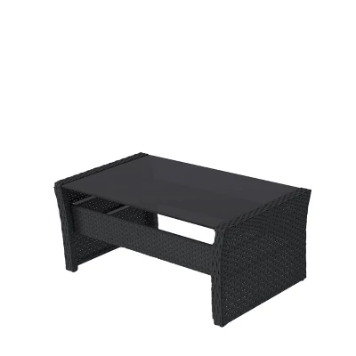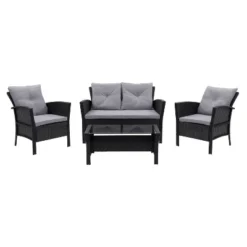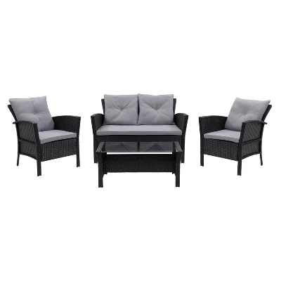 Spring into summer with this inviting four-piece patio set. The Cascade patio set is made of a durable powder-coated steel frame and wrapped in a UV-resistant resin rattan wicker. The comfortable cushions are made from 2″ foam wrapped in 1″ soft batting covered with durable high-grade outdoor polyester upholstery. The tabletop is finished with a tempered glass top that is the perfect resting spot for books, sunscreen, and towels. This complete set adds a splash of personality to any outdoor space!
