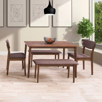 A trendy set with classic lines, these dining chairs and dining bench bring function and style to your dining room. The matching chairs have a cushioned base, with padded back support, and the benches have a padded seat for comfort. They match perfectly with the mid-century modern table allowing for plenty of dining space. Set includes 1 table, 2 chairs and 2 benches