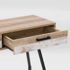 A mid-century modern design balanced with a warm rustic feel, this console table is a show-stopper in any entryway or office space. With ample storage for your out-the-door essentials, the beautiful duo-tone drawer doors with high quality powder coated metal handles keep your space tidy and organized. With gorgeous splayed legs and center support bar, this piece is perfect for living rooms or entryways.