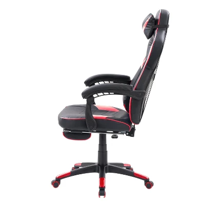 Perfect for long gaming sessions, the Doom gaming chair is an excellent addition to your home office or game room. This ergonomic chair tilts and reclines for a full range of motion and sits on a 5-star base that effortlessly glides across any floor. It has a gas lift to adjust to the perfect height, 3-dimensional armrests, and a footrest for the ultimate support. Upholstered in all-black durable PVC with sleek contrasting detail and a matching support pillow, it’s the ideal gaming chair.