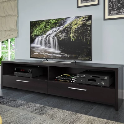 Upgrade your home theater with the TV media stand from the Fernbrook Collection. The wide surface is practical for a mounted or sitting TV. Available in our black faux wood grain finish and accented with metal aluminum handle pull. This bench is a beautiful combination of open and concealed storage space and is built to accommodate most TVs up to 95 inches, a great addition to any living room or entertainment space