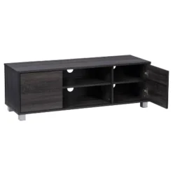 Take your living room to the next level with this stylish modern TV stand. Comprised of two cupboards, and open shelves for a sleek yet classic appearance. This entertainment center creates additional storage space in your home for media, electronics, accessories, books, or decor. The beautiful rich wood grain finish with silver pillar legs looks great in any aesthetic. This bench fits most TVs up to 55″ and is the perfect combo of classic colors and finishes.