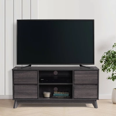 Take your living room to the next level with this stylish modern TV stand. Made with flared wood legs, four drawers, and four open shelves for a mid-century modern appearance. This entertainment center creates additional storage space in your home for media, electronics, accessories, books, or decor. The beautiful rich wood grain finish looks great in any aesthetic. This bench fits most TVs up to 55″ and is the perfect combo of classic colors and modern lines.