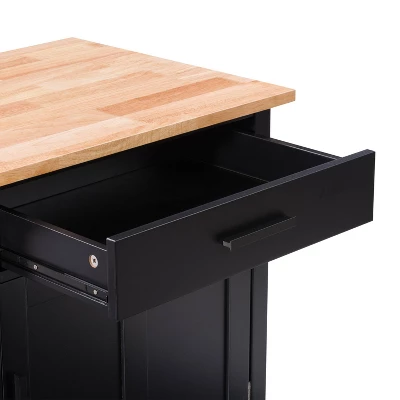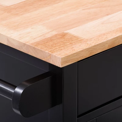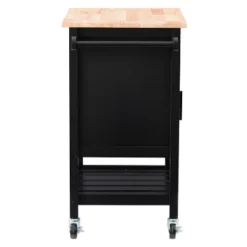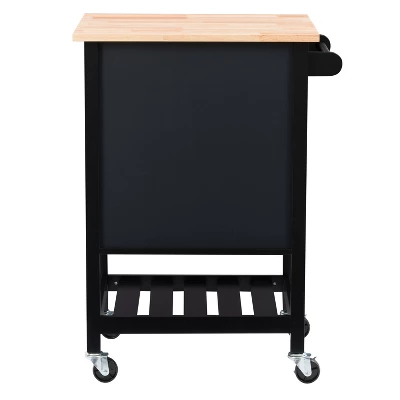 Compact kitchen? No problem! Add extra space to work, serve, and stow away kitchen accessories with this must-have kitchen cart. Its frame is clean-lined and showcases a classic finish to fit in any home’s aesthetic. The top has a neutral wood grain finish and the pinewood legs are supported by four wheels with locking castors so your cart stays in the location of your choosing or can be moved at any time. With open and closed storage from the drawer to the cabinet, towel rack, and shelf you have ample space to keep all your kitchen necessities within arms reach.