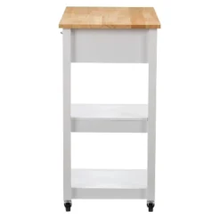Compact kitchen? No problem! Add extra space to work, serve, and stow away kitchen accessories with this must-have kitchen cart. Its frame is clean-lined and showcases a classic finish to fit in any home’s aesthetic. The top has a neutral wood grain finish and the pinewood legs are supported by four wheels with locking castors so your cart stays in the location of your choosing or can be moved at any time. With open and closed storage from the drawer to the cabinet, towel rack, and shelf you have ample space to keep all your kitchen necessities within arm’s reach. Product Dimensions: 35″H x 32″W x 18″D